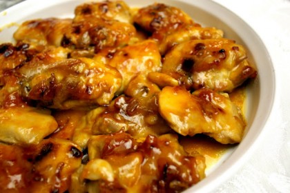 - Heat the olive oil in a lidded frying pan and brown the chicken