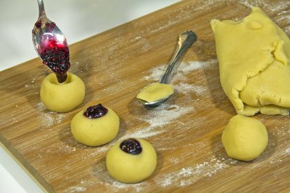 - Roll two level teaspoons of dough into a ball and place onto a greased baking tray. Indent dough ball with the handle of a wooden spoon, fill cavity with a little jam and top with a flaked almond. Repeat with remaining dough and almonds, allowing about 4cm between biscuits.