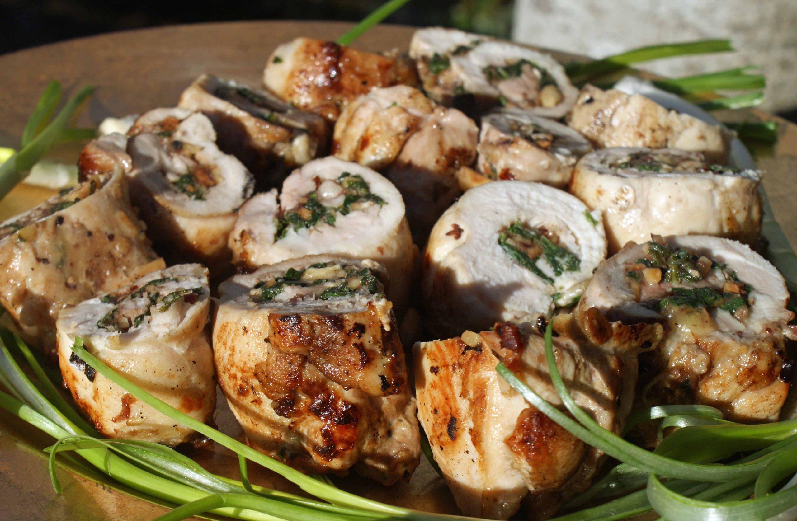 - 2 Spread chicken thighs on a work surface and butterfly the thicker end sections. Divide the mixture between the breasts and spread over the thigh surfaces. Roll each thigh tightly and tie with unwaxed kitchen string.